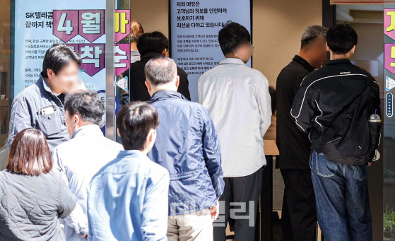 해킹 공격으로 가입자 유심 정보가 탈취된 SK텔레콤이 가입자 유심 무상 교체를 시작한 28일 서울 마포구의 한 T월드 본사 직영 대리점을 찾은 고객들이 유심을 교체하기 위해 대기하고 있다. |
