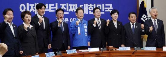 이재명 더불어민주당 대선 후보가 28일 국회에서 열린 최고위원회의에서 선거용 점퍼를 입고 최고위원들과 화이팅을 외치고 있다.2025.4.28 김현민 기자 |