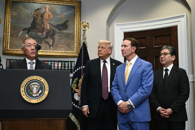 지난달 23일(현지시간) 백악관에서 열린 발표회에서 연설 중인 정의선 현대차그룹 회장(왼쪽부터)과 도널드 트럼프 미국 대통령, 제프 랜드리 루이지애나 주지사, 장재훈 현대자동차 부회장.(사진=AFP) |