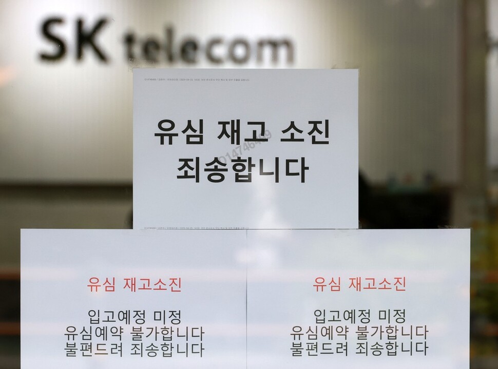 지난 27일 서울 용산구 한 에스케이(SK)텔레콤 대리점에 유심 재고 소진 안내문이 붙어있다. 김혜윤 기자 unique@hani.co.kr |