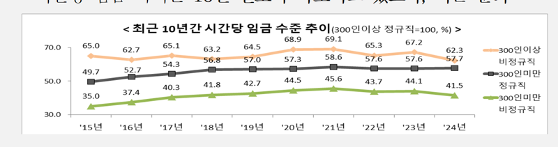 그러나 고용형태별로 보면 정규직은 2만7703원으로 전년 대비 11.7% 증가했으나 비정규직은 1만8404원으로 4.7% 늘어나는데 그쳤다. 정규직의 시간당 임금총액을 100으로 보면 2020년 이후로는 비정규직 임금이 70%대를 유지했지만, 지난해 66.4%로 떨어지며 2016년 수준으로 뒷걸음질쳤다.