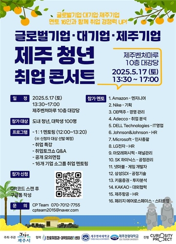 (제주=연합뉴스) 박지호 기자 = 제주시는 오는 5월 17일 오후 1시 30분 제주벤처마루 10층 대강당에서 '청년 글로벌기업 취업멘토링 콘서트'를 연다고 29일 밝혔다.