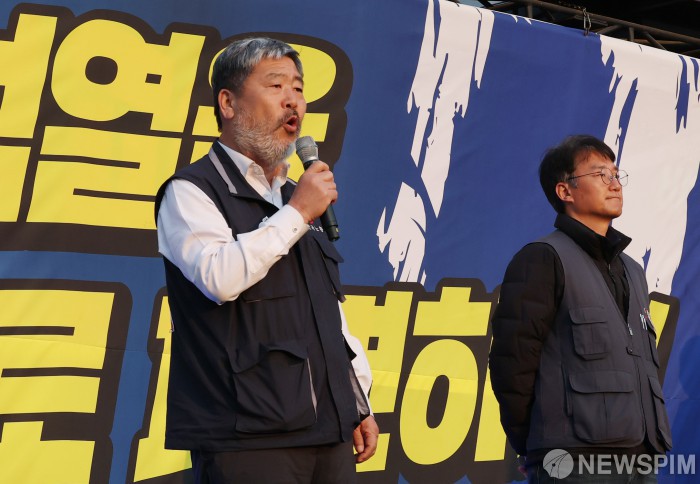 [서울=뉴스핌] 이호형 기자 = 김동명 한국노동조합총연맹(한국노총) 위원장이 1일 오후 서울 광화문 월대 앞에서 열린 24시간 철야 집중행동 선포 결의대회서 윤석열 파면 촉구를 외치고 있다. 2025.04.01 leemario@newspim.com |