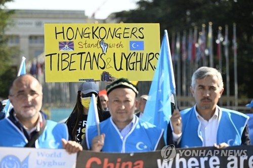 유엔 위구르 인권 시위지난 2022년 5월 스위스 제네바에 있는 유엔 유럽 본부 앞에서 위구르족 인권 단체 관계자들이 중국 내 인권 상황에 대해 소수민족 커뮤니티의 의견을 들어달라며 시위를 벌이는 모습. [EPA=연합뉴스]
