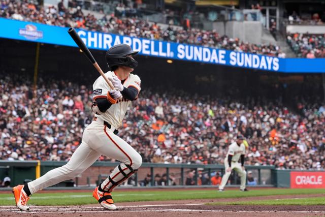 샌프란시스코의 이정후가 28일(한국시간) 미국 캘리포니아주 샌프란시스코 오라클파크에서 열린 2025 메이저리그 텍사스와 경기에서 1회말 우전 안타를 치고 있다. 샌프란시스코=AP 뉴시스 |