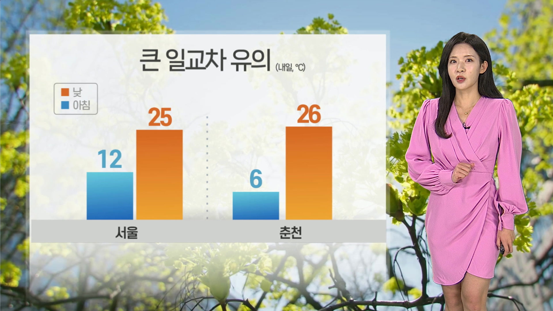 내일 아침 서울 12도, 춘천 6도에서 출발하겠고요, 한낮에는 서울 25도, 춘천 26도까지 기온이 오르겠습니다.