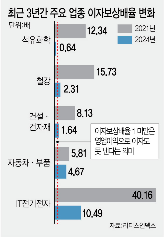 위기가 가장 심각한 곳은 석유화학이다. 석화 37개 기업의 평균 이자보상배율은 2021년 12.34에서 지난해 0.64까지 떨어졌다. 리더스인덱스가 분류한 전체 18개 업종 중 최저치다. 사실상 업계 전체가 좀비화(化)했다는 해석이 가능하다.