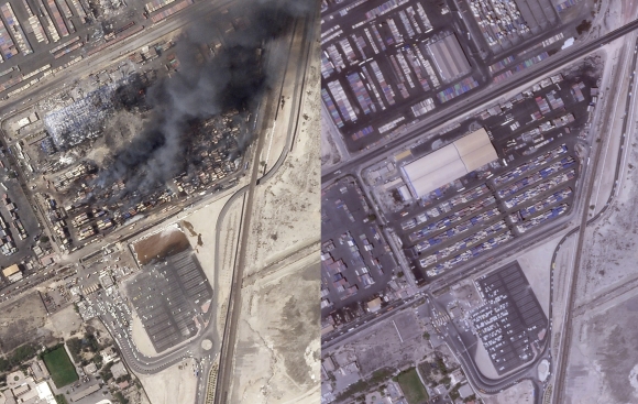 폭발이 일어난 후인 지난 28일 미국 상업위성 회사 플래닛 랩스가 촬영한 사진을 보면 마치 폭탄이 떨어진 듯 여러 건물이 불에 타면서 검은 연기가 치솟는 것이 멀리 위성으로도 확인된다. 특히 이달 9일 같은 곳을 촬영한 위성사진에는 건물과 컨테이너로 보이는 화물 등이 반듯하게 자리 잡고 있어 폭발의 여파가 얼마나 큰지 쉽게 비교가 가능하다.