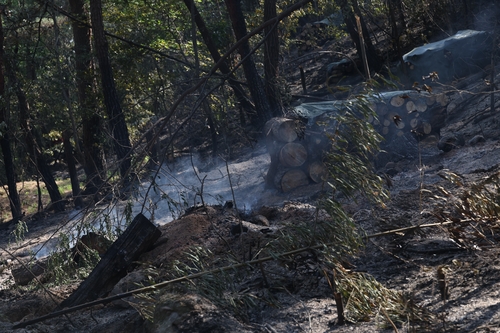 산불의 위력을 실감케 하듯 발화 추정지 일대에는 여전히 연기가 피어올랐고 불길이 올라오는 곳도 있었다.