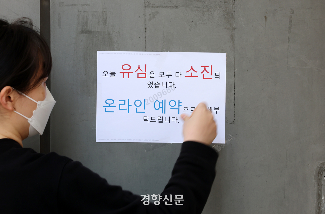 SK텔레콤 유심 무상 교체 이틀째인 29일 서울 종로구의 한 SKT 매장 앞에서 매장 직원이 유심 소진을 알리는 문구를 벽에 붙이고 있다. 정지윤 선임기자 |