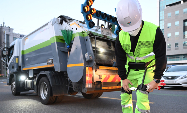 직접 로봇을 입고 이달 28일 새벽 5시께 작업용 차량에 탑승해 구로구청을 출발했다. 이 시간대 출발하는 ‘새벽기동조’는 민간 업체들이 미리 정리해 내놓은 일반 쓰레기와 무단 투기물을 차량으로 옮기는 작업이 목표다. 대상 구간은 구로구청부터 가리봉시장까지 왕복 3㎞가량. 환경미화원들이 차량으로 던져넣는 75ℓ 종량제 봉투의 무게는 상당했다. 홍승만 구로구 환경공무관은 “종량제 봉투 하나에 7~8㎏ 정도 나간다”면서 “무단 투기물이 마구 섞여 있으면 혼자 들기 힘들 정도로 무거운 경우도 있다”고 했다.