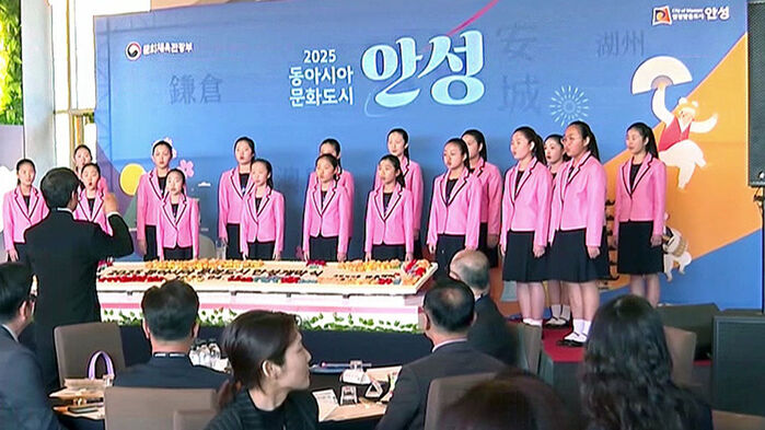 경기도 안성시립소년소녀합창단이 일본과 중국에서 온 손님들을 위해 합창 공연을 벌입니다.