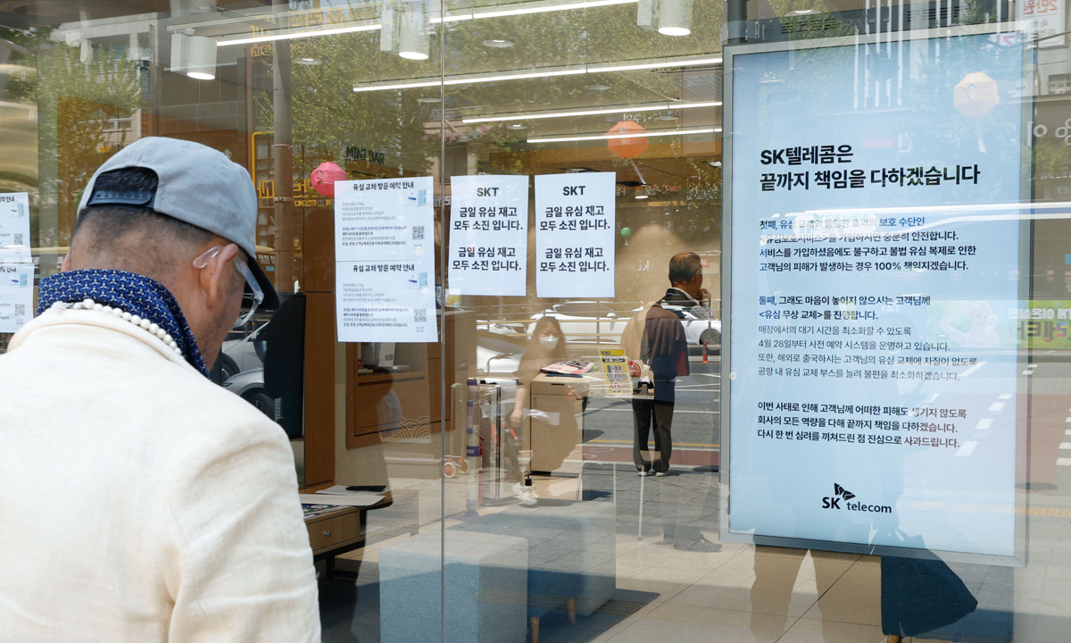 SK텔레콤 이용자 유심(USIM) 정보 해킹 사태로 유심 무료 교체 정책이 시행된 지 이튿날인 29일 서울 시내의 한 T월드 매장에 유심 교체 관련 안내문이 붙어 있다. 최상수 기자 |