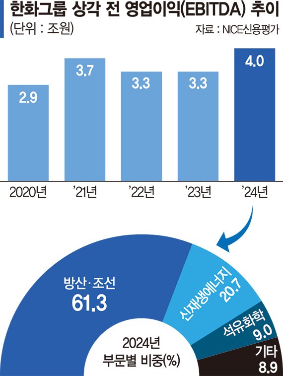 29일 NICE신용평가에 따르면 금융부문을 제외한 한화그룹의 EBITDA는 2021년 3조7233억원, 2022년 3조2813억원, 2023년 3조2977억원, 2024년 4조307억원이다. 한화, 한화호텔앤드리조트, 한화갤러리아, 한화비전을 포함한 숫자다.