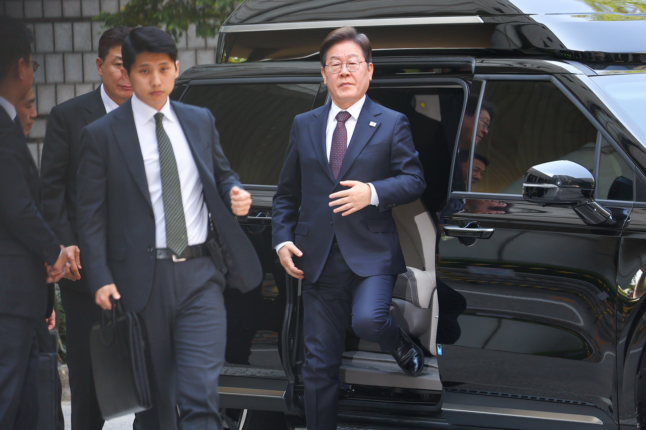 이재명 더불어민주당 대선 후보가 29일 서울 서초구 서울중앙지방법원에서 열린 대장동 배임·성남FC 뇌물 사건 1심 속행 공판에 경호를 받으며 출석하고 있다. [연합] |