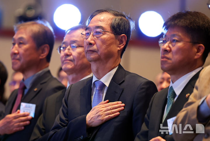 [서울=뉴시스] 최진석 기자 = 한덕수 대통령 권한대행 국무총리가 29일 서울 강남구 건설회관에서 열린 해외건설 1조달러 수주 및 60주년 기념식에서 국기에 경례하고 있다. 2025.04.29. myjs@newsis.com