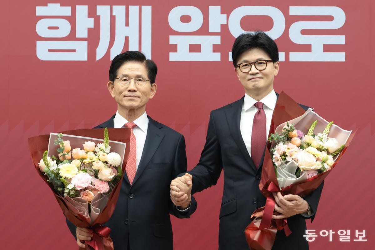국민의힘 2차 경선 결선에 진출한 김문수, 한동훈 후보가 29일 오후 서울 여의도 중앙당사에서 열린 제21대 대통령후보자 선출을 위한 3차 경선 진출자 발표에서 꽃다발을 들고 기념촬영을 하고 있다. 이훈구 기자 ufo@donga.com |