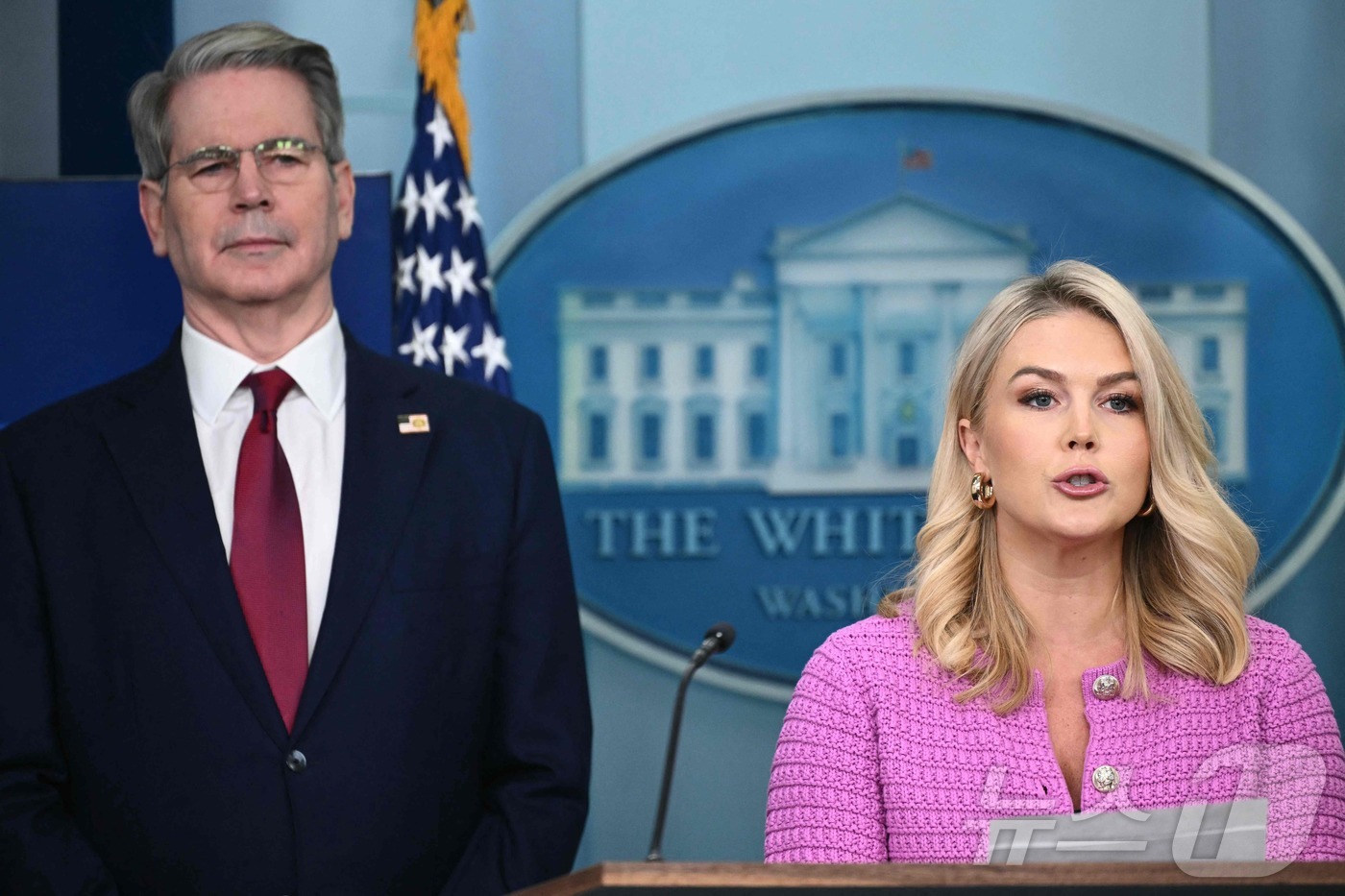 캐롤라인 레빗 백악관 대변인이 29일(현지시간) 워싱턴DC 백악관 브래디 브리핑룸에서 열린 브리핑에서 스콧 베선트 미 재무부 장관이 지켜보는 가운데 발언하고 있다. ⓒ AFP=뉴스1 ⓒ News1 류정민 특파원 |