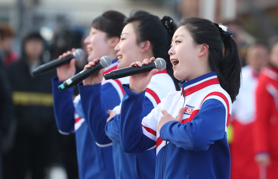 2018년 평창 올림픽을 위해 방남했던 북한 응원단이 ‘반갑습니다’를 부르고 있다. [중앙포토] |