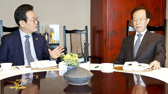 이재명 더불어민주당 대선 후보가 지난해 11월 여의도 한 식당에서 이석연 전 법제처장과 만나 대화하고 있다. 당시 이 후보는 ″통합에 가장 큰 위험요소가 정치보복″이라며 ″이를 멈춰야 한다″고 주장했다. 연합뉴스 |
