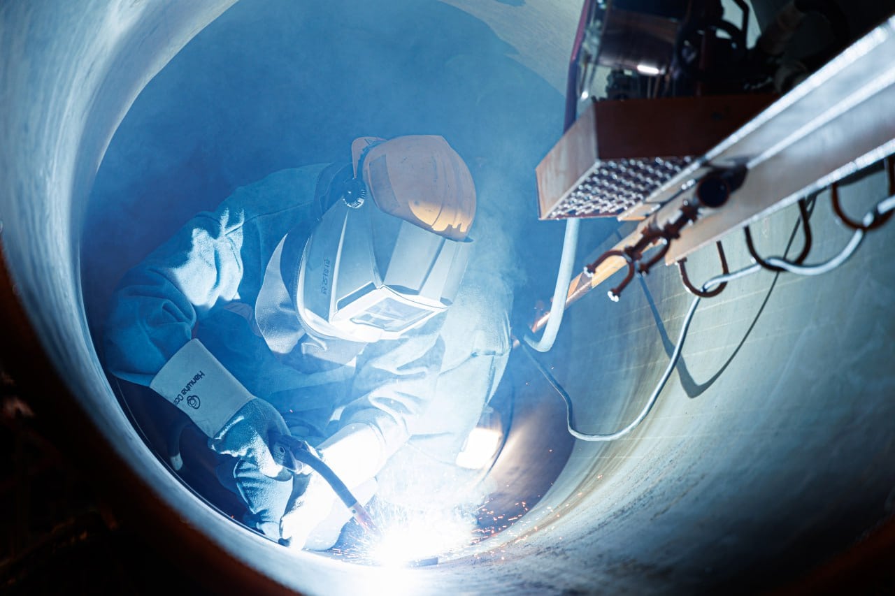 김인득 한화오션 기원이 현재 경남 거제 한화오션 조선소에서 건조 중인 3600t급 잠수함 ‘장보고-Ⅲ 배치-Ⅱ’의 미사일 발사관을 용접하고 있다. 잠수함의 선체와 주요 설비는 수백t의 압력을 이겨내는 특수 합금으로 만들어야 하기 때문에 이 금속을 다루는 특수 용접 기술이 필수다./한화오션 |