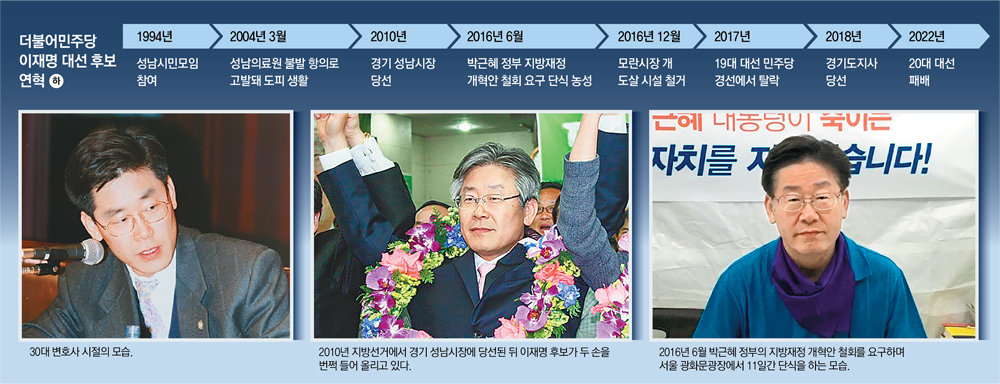 변방의 장수였던 이 후보가 중앙 정치권의 주목을 받은 건 2016년 지방자치단체 예산권을 둘러싼 박근혜 정부와의 갈등으로 11일간 단식 농성을 하면서다. 그해 10월 국정농단 사건이 터지자 이 후보는 제도권 정치인 중 처음으로 박 대통령 하야를 공개 주장했다. 이후 이 후보는 2017년 대선 경선 출마와 2018년 경기도지사를 거쳐 유력 대선 주자로 자리매김했다.