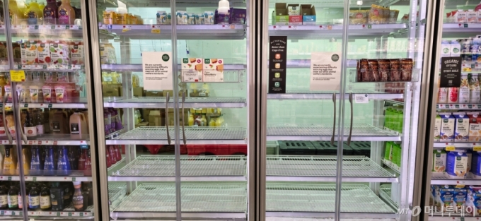 지난 2월 달걀 파동 당시 미국 뉴저지주 유통매장 홀푸드의 달걀 판매대가 텅 비어 있다. /사진=심재현 특파원 |