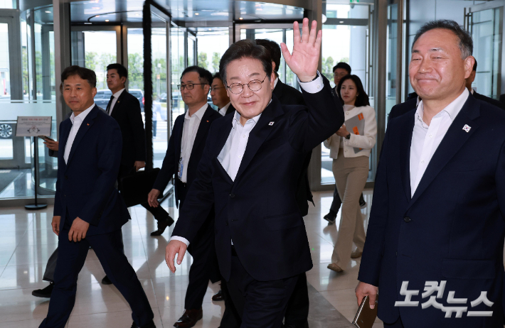 이재명 더불어민주당 대선 후보가 28일 경기도 이천시 SK하이닉스를 방문해 간담회장으로 이동하며 손을 들어보이고 있다. 국회사진취재단 |