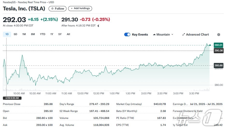 29일(현지시간) 뉴욕증시에서 테슬라는 2.15% 급등한 292.03달러를 기록했다. 이로써 시총도 9406억달러로 불어 다시 1조달러 돌파를 눈앞에 두었다.