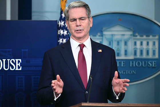 스콧 베센트 미국 재무장관이 29일(현지시간) 워싱턴 DC 백악관에서 도널드 트럼프 대통령 취임 100일 경제 성과에 대해 브리핑하고 있다. AFP=연합뉴스 |