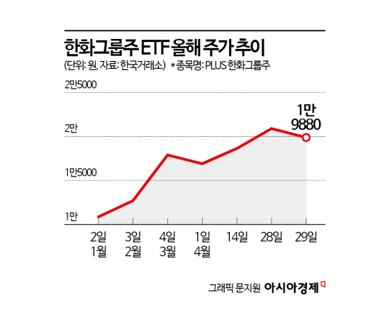 그룹주의 동반 하락에 한화그룹주 상장지수펀드(ETF)도 약세를 보였다. 전일 PLUS 한화그룹주는 4.61% 하락한 1만9880원에 마감했다. 올들어 PLUS 한화그룹주 ETF는 89.24% 오르며 최근 주가가 2만원을 넘었으나 이날 하락으로 다시 2만원 아래로 떨어졌다.