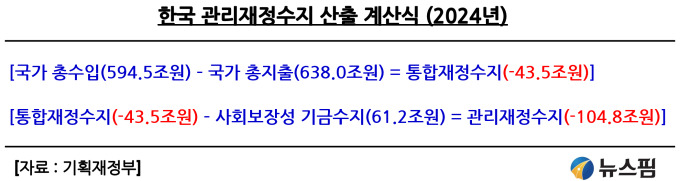 따라서 한국에서는 관리재정수지를 재정운용 목표로 산출하여 사용하고 있다. 2024년의 통합재정수지와 관리재정 수지를 산식으로 표현해보면 아래와 같다.