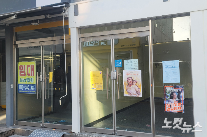 부산대 앞 거리의 상가 두 곳이 나란히 비어 있다. 박중석 기자 |