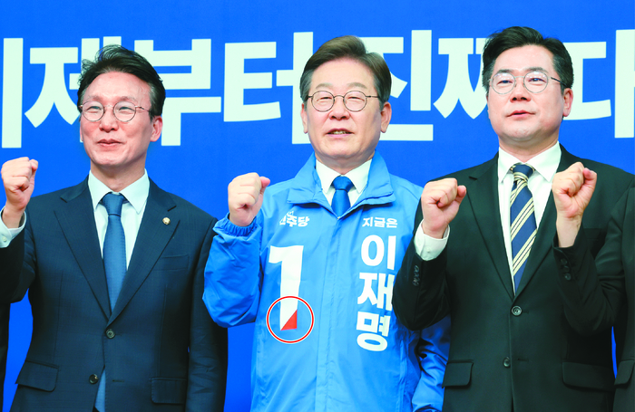 이재명 더불어민주당 대선 후보가 지난 28일 최고위원회의에서 파이팅을 외치며 기념촬영을 하고 있다. 이 후보가 입은 점퍼의 기호 1번 숫자 귀퉁이(빨간 원)엔 국민의힘이 사용하는 빨간색이 칠해져 있다. 민주당은 “진보와 보수 지지층 모두를 아우르겠다는 의미”라고 설명했다. [김호영 기자] |