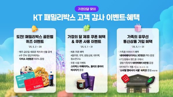 유무선 통신 상품 가입 고객을 대상으로 한 추가 혜택도 마련했다. 최근 3년 이내 가족이 30일 이상 이용한 폰을 이어 사용할 경우 ‘가족폰 이어쓰기’ 이벤트를 통해 네이버페이나 다이소 교환권(3만 원 상당)을 제공하며, KT닷컴에서 휴대폰을 구매하면 결합 가족에게 네이버페이 6만 원을 추가 지급한다. 패밀리박스를 통해 인터넷과 TV 상품을 신규 개통하는 고객 중 추첨을 통해 5성급 호텔 ‘소피텔 앰배서더 서울’ 숙박권도 제공한다.