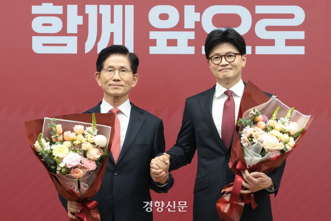 김문수·한동훈 국민의힘 대선 경선 후보가 지난 29일 서울 여의도 중앙당사에서 결선 진출자로 발표된 뒤 기념촬영을 하고 있다. 국회사진기자단 |