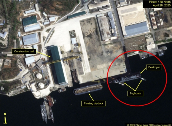 2025년 4월 28일(현지시간) 민간 위성 서비스 플래닛랩스가 촬영한 위성 사진은 북한의 5000t급 신형 구축함 ‘최현함’(최현호)이 25일 진수식을 가진 지 사흘 만에 다시 건선거 쪽으로 옮겨지는 모습을 보여준다. 출처=플래닛랩스 |