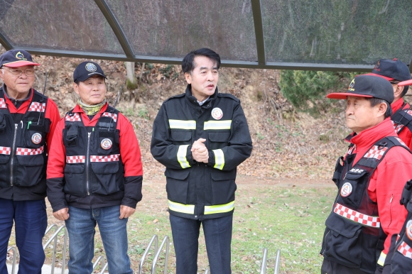 최재형(왼쪽에서 세번째) 보은군수가 산불진화대원들을 격려하고 있다. 보은군 제공. |
