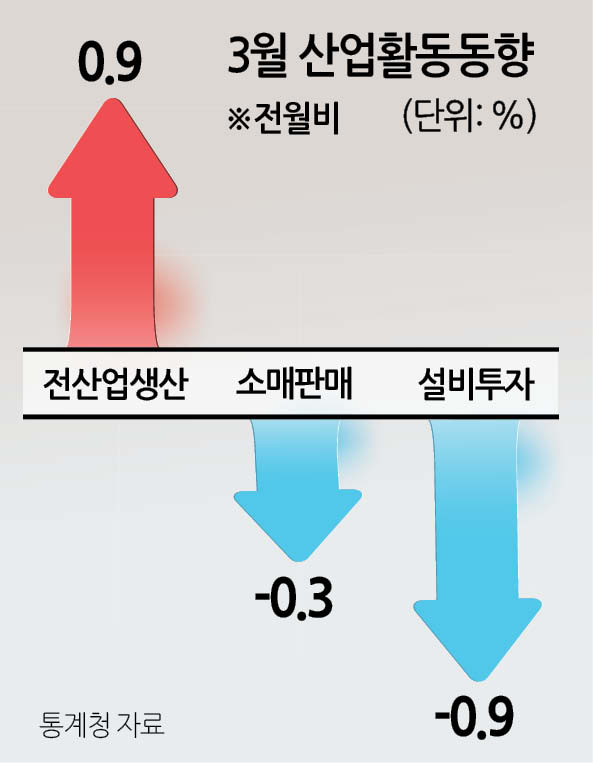 3월 전산업생산이 2개월 연속 증가 흐름을 이어갔지만 서비스업 생산과 소매판매, 투자가 감소하는 등 내수 지표들은 줄줄이 부진을 면치 못한 것으로 나타났다. 최근 대내외 경제 불확실성이 커진 상황에서 우리 경제의 3대 축인 생산·소비·투자는 지난 1월 ‘트리플 감소’, 2월 ‘트리플 증가’를 나타낸 데 이어 이달에는 항목별로 방향성을 달리하면서 ‘오락가락’ 양상을 지속하는 모습이다.