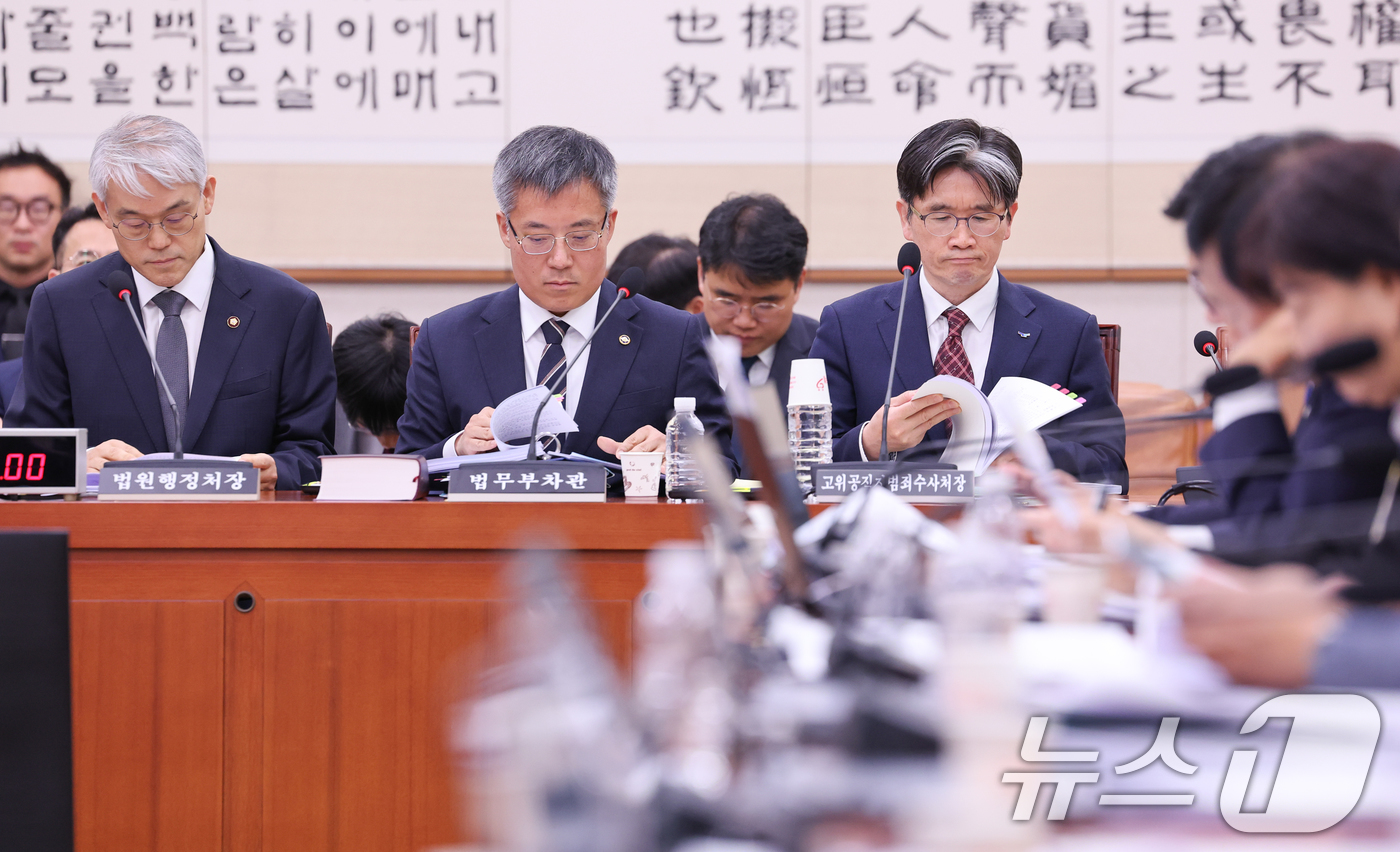 (서울=뉴스1) 안은나 기자 = 30일 서울 여의도 국회에서 열린 법제사법위원회 제424회국회(임시회) 제3차 전체회의에서 쌍특검법이 상정된 가운데 천대엽 법원행정처장(왼쪽부터), 김석우 법무부 장관 직무대행, 오동운 공수처장이 출석해 있다. 2025.4.30/뉴스1