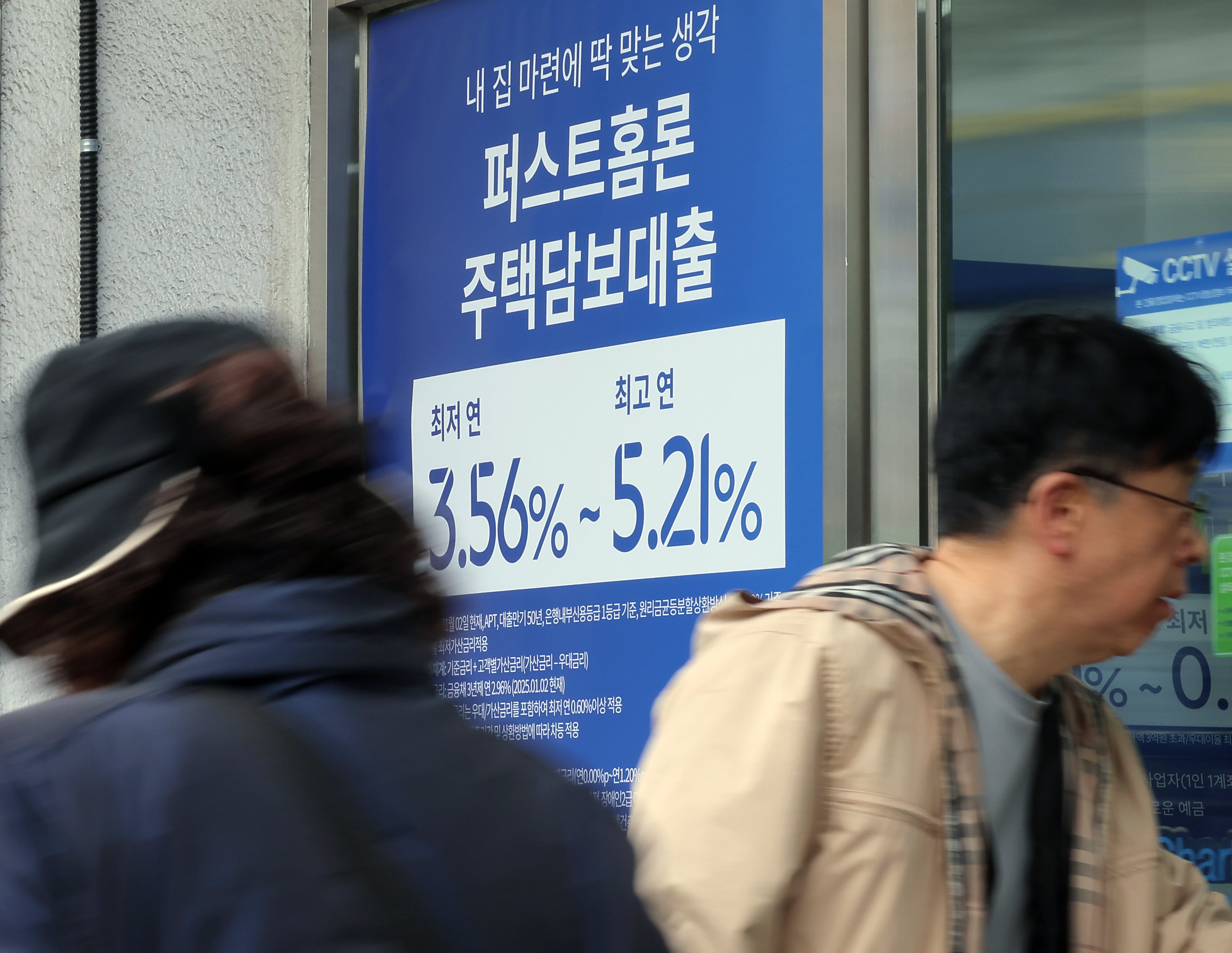 서울 시내의 한 은행 입구에 주택담보대출 상품 금리 홍보물 앞으로 시민이 지나고 있다. /뉴스1 |