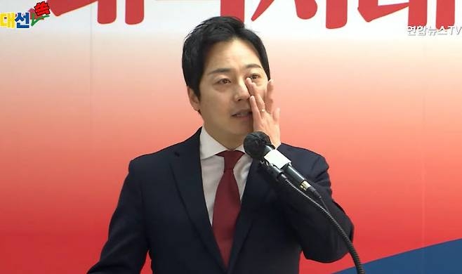 이어 마이크를 잡은 이성배 대변인은 “홍준표 후보를 24시간 옆에서 모시며 진심으로 생각했다. ‘정말 이재명 후보를 이길 수 있겠구나’라고. ‘양극단으로 갈라진 대한민국을 정상화시킬 수 있겠구나’ 하는 믿음이 매일 커졌다”고 말하며 눈물을 보였다.
