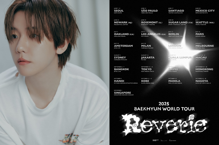 소속사 아이앤비백은 2025 백현 월드 투어 '레버리'(Reverie)가 오는 6월 7~8일 서울 송파구 올림픽공원 체조경기장을 시작으로 총 29개 도시에서 열린다고 30일 밝혔다.