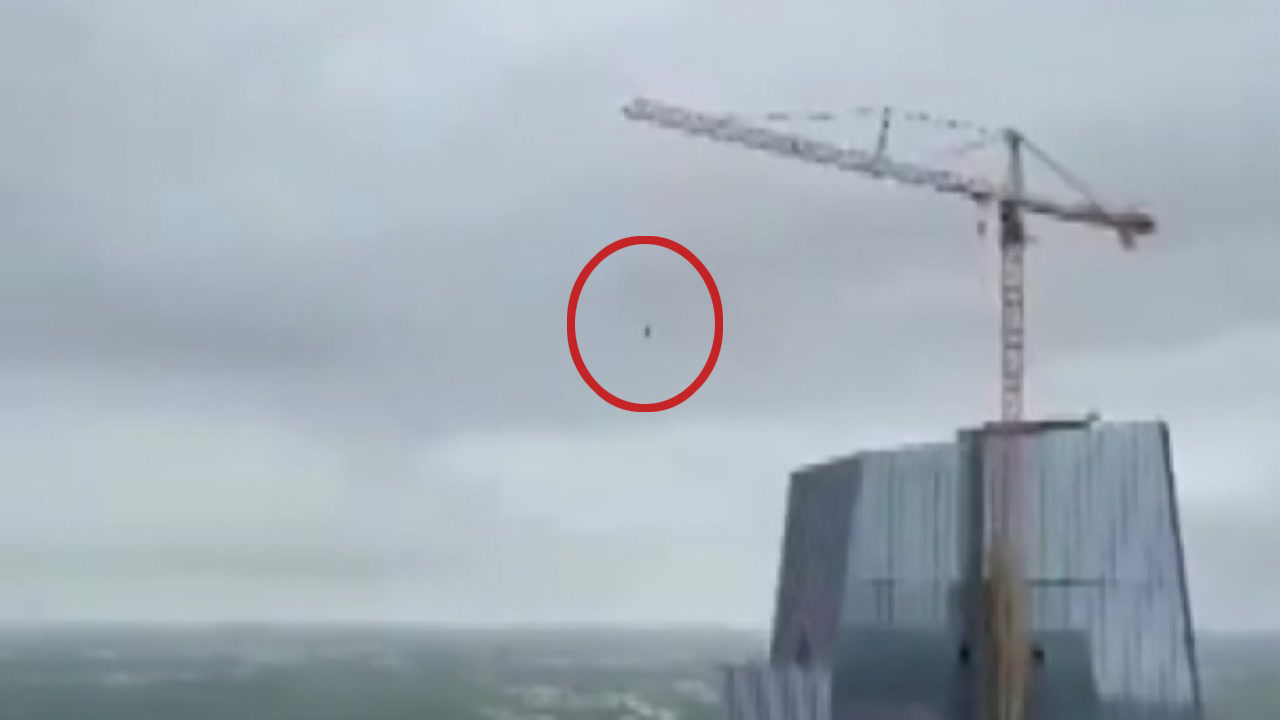 도심 속 초고층 크레인에 사람이 매달려 있는 장면이 포착됐습니다.