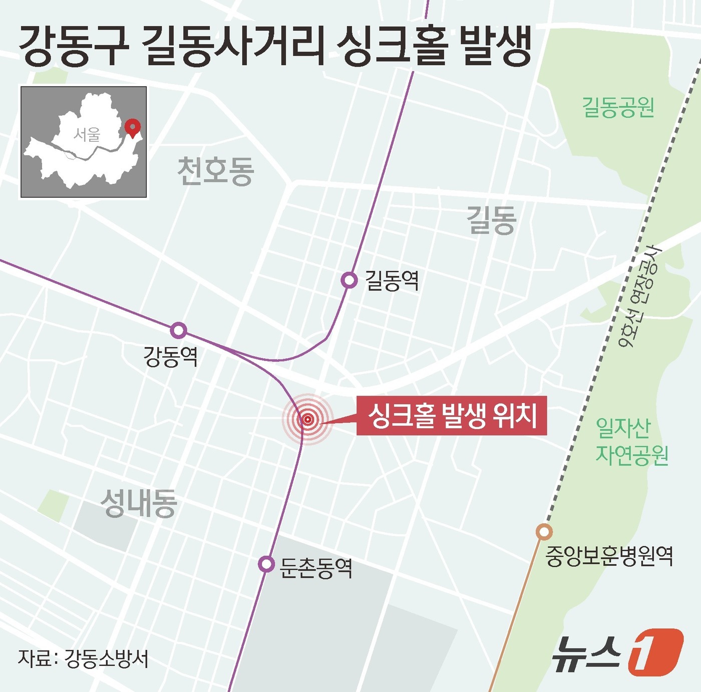 (서울=뉴스1) 김지영 디자이너 = 30일 오후 3시 23분쯤 서울 강동구 둔촌동역 인근 도로에 땅 꺼짐(싱크홀) 현상이 발생했다. 서울강동소방서에 따르면 인명 피해는 발생하지 않았으며, 현재 안전조치 중이다.