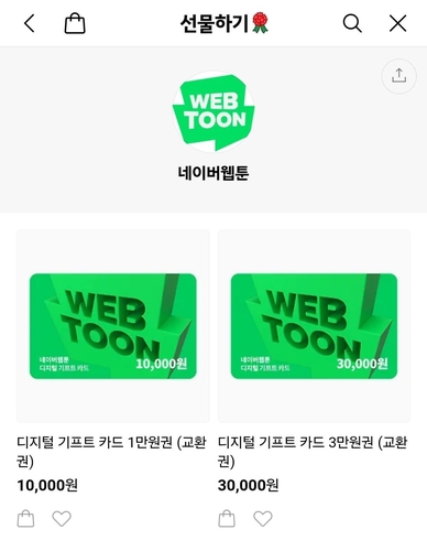 네이버웹툰은 30일부터 '카카오톡 선물하기'에서 '디지털 쿠키 기프트카드 교환권' 1만원권과 3만원권을 판매한다고 밝혔다.