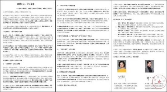 실명으로 반공 선언문을 올린 린잉(63세) 생물과학 및 공학대학 학장과 같은 단과대학의 한솽옌(49세) 교수는 '작은 불씨가 초원의 태울 수 있다'는 제목으로 공산당의 독재와 인권 탄압, 검열, 역사 왜곡 등을 강하게 비판했다. 특히 시진핑의 장기집권과 제로 코로나 정책(중국이 확진자 수를 0으로 만드는 것을 목표로 한 초강력 방역 정책으로 중국 경제에 큰 타격을 줌), 996(오전 9시부터 오후 9시까지 주 6일 근무) 노동 착취, 천안문 사건의 은폐 등을 구체적으로 지적했다.