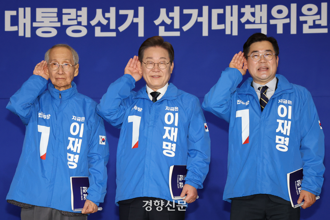 이재명 더불어민주당 대선 후보(가운데)와 윤여준(왼쪽), 박찬대 상임총괄선대위원장이 30일 국회 의원회관에서 열린 중앙선대위출범식에서 국민의 목소리에 귀를 기울이겠다는 의미의 ‘경청 퍼포먼스’를 하고 있다. 박민규 선임기자 |