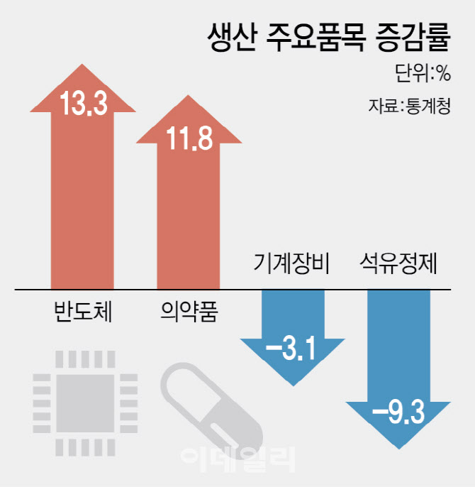 반도체 영향이 컸다. 특히 D램과 플래시메모리 등 메모리반도체 수요가 늘어나면서 반도체 생산이 13.3% 늘었다. 2023년 8월(13.6%) 이후 19개월 만에 최대 증가 폭이다.