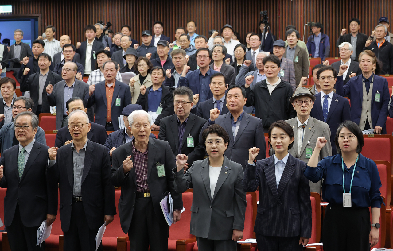 28일 국회 도서관에서 열린 사회대개혁시민정치행동 출범식 및 1만인 선언에서 조국혁신당 김선민 당대표 권한대행, 진보당 김재연 대선 후보, 기본소득당 용혜인 대표 등 참석자들이 임을 위한 행진곡을 제창하고 있다 . [연합] |
